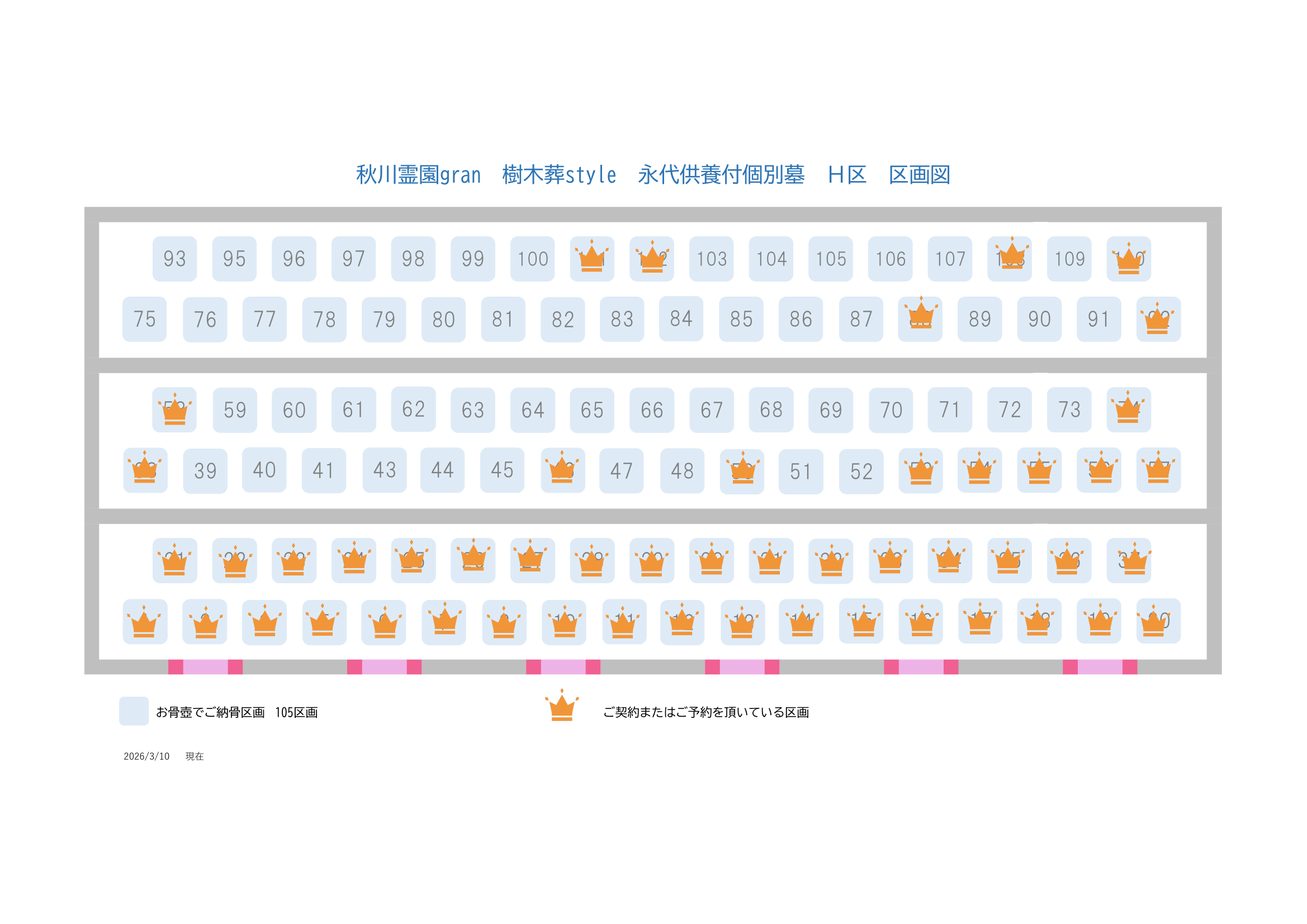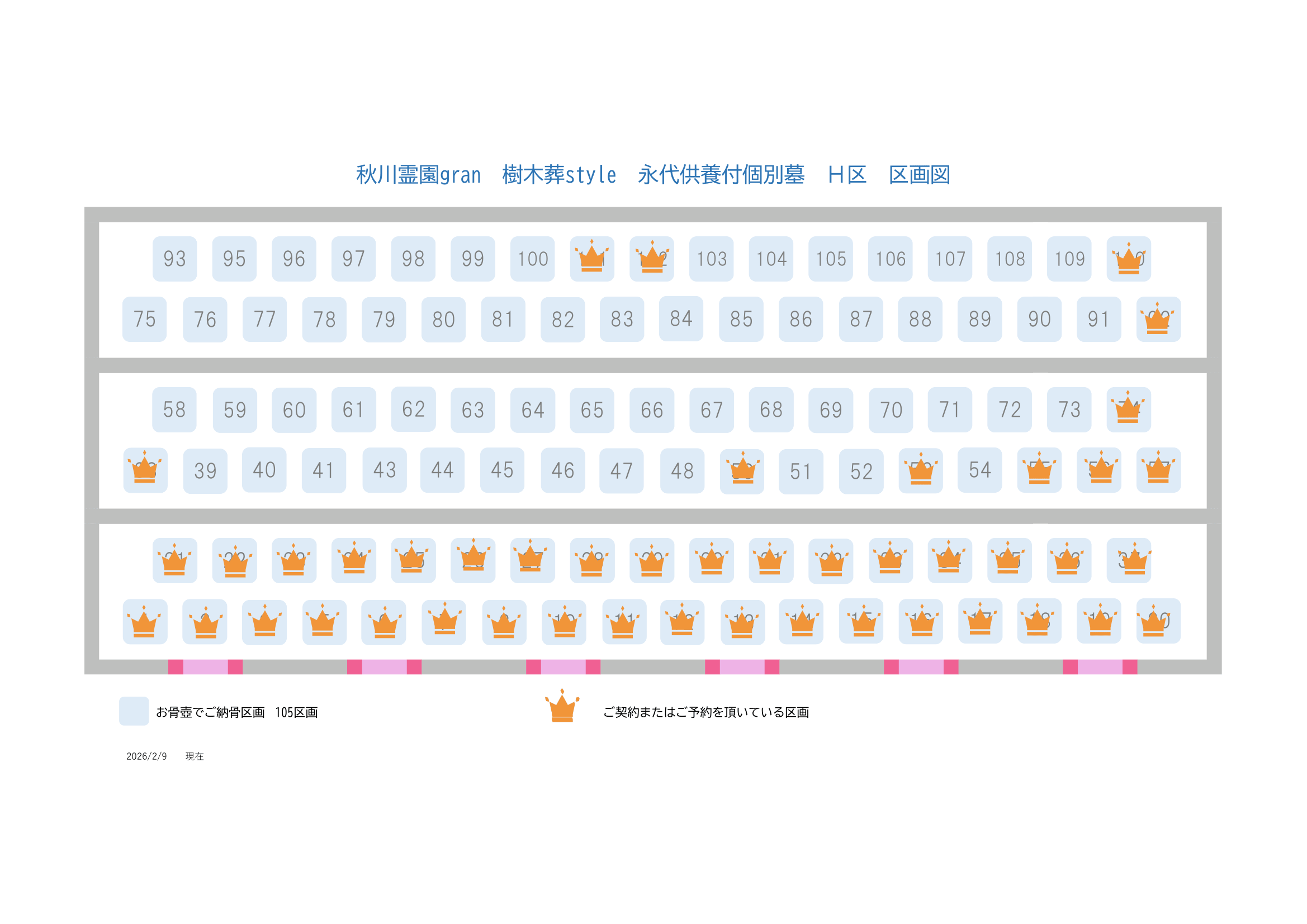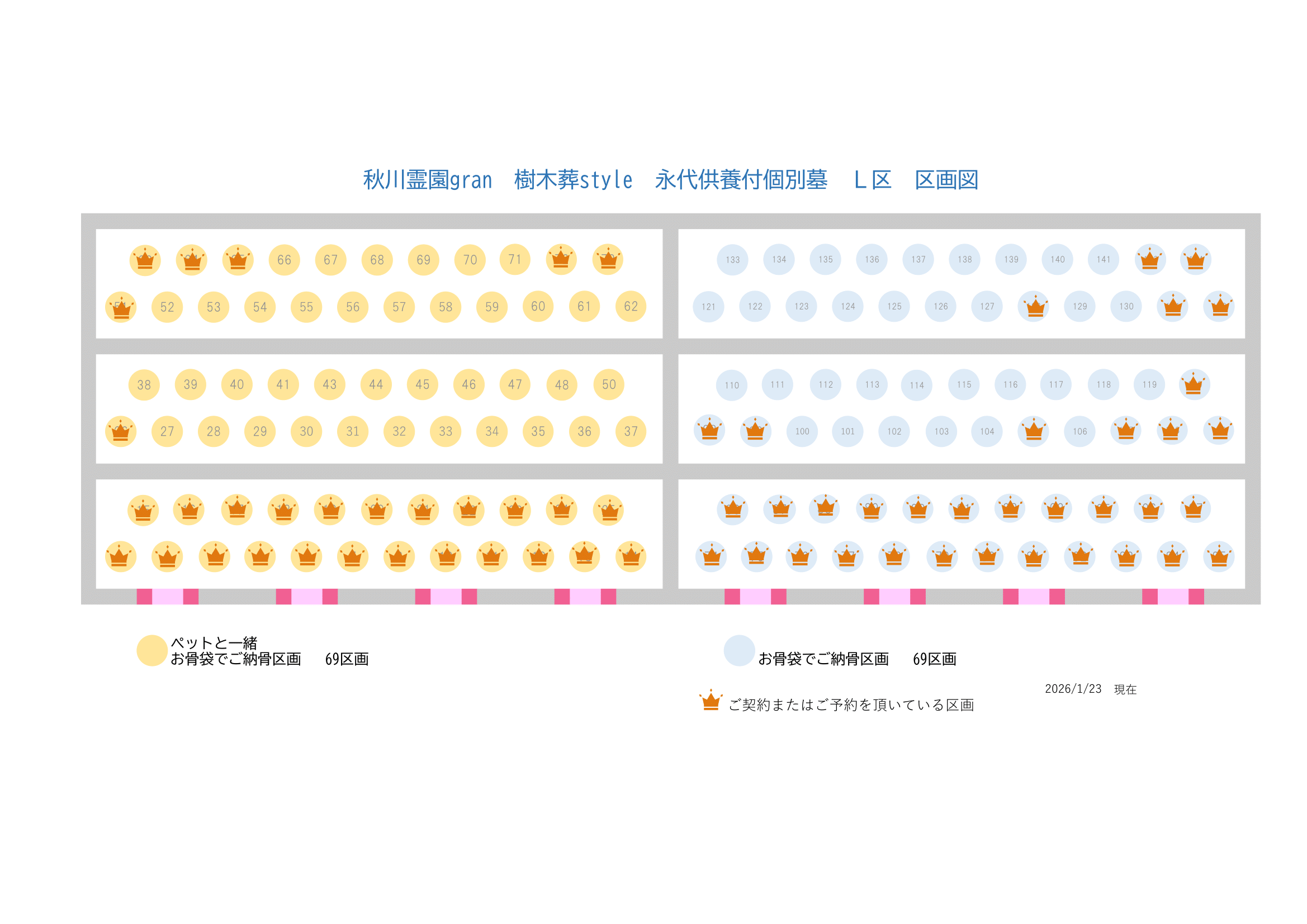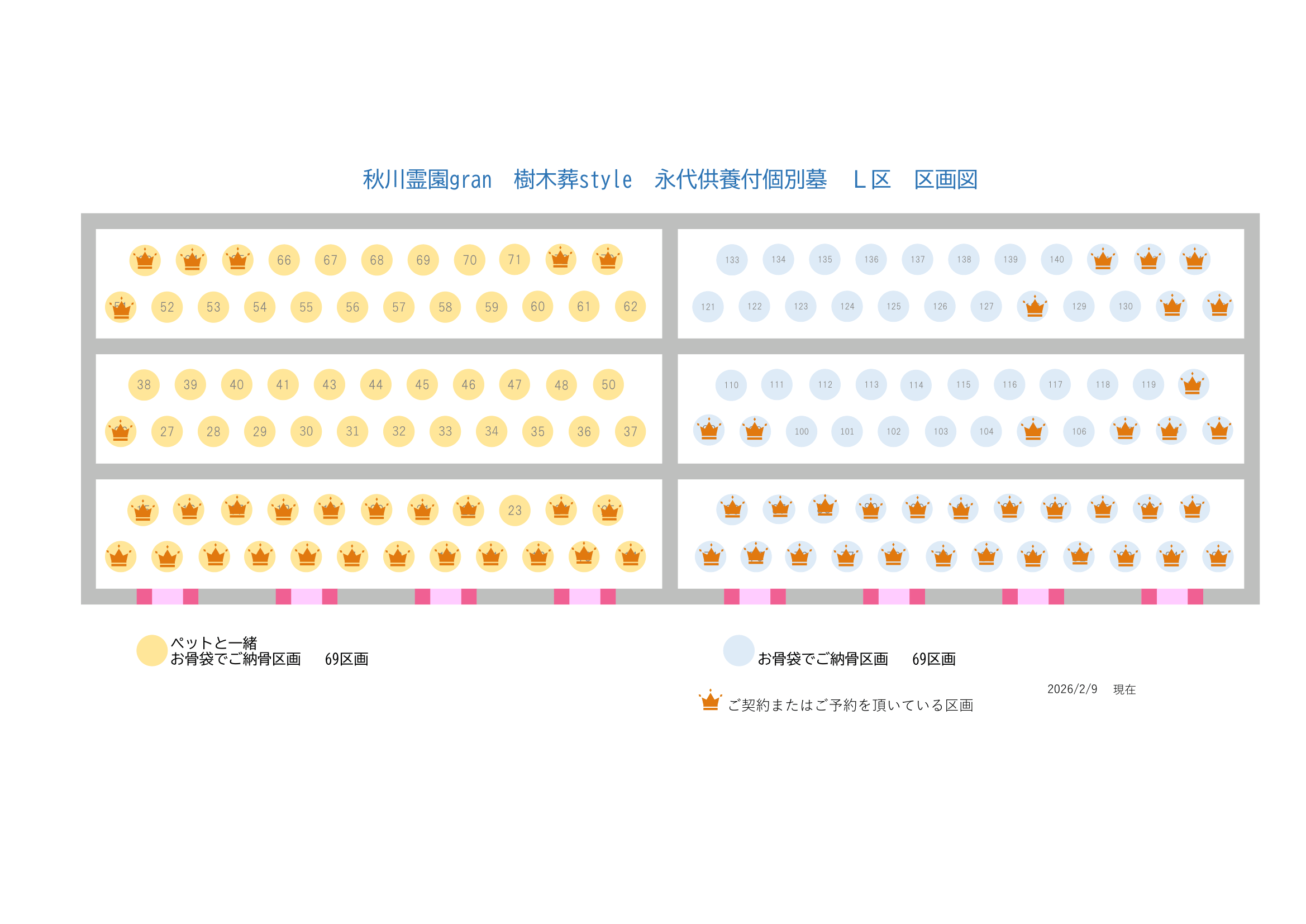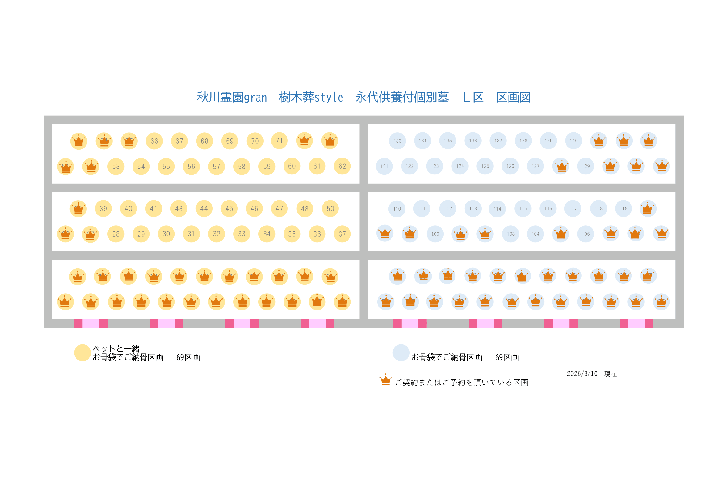 秋川霊園granでは、A~Gの7区画に、2025年9月より新たにH〜Lの新区画が加わった全12区画の樹木葬墓地をご用意いたしております。