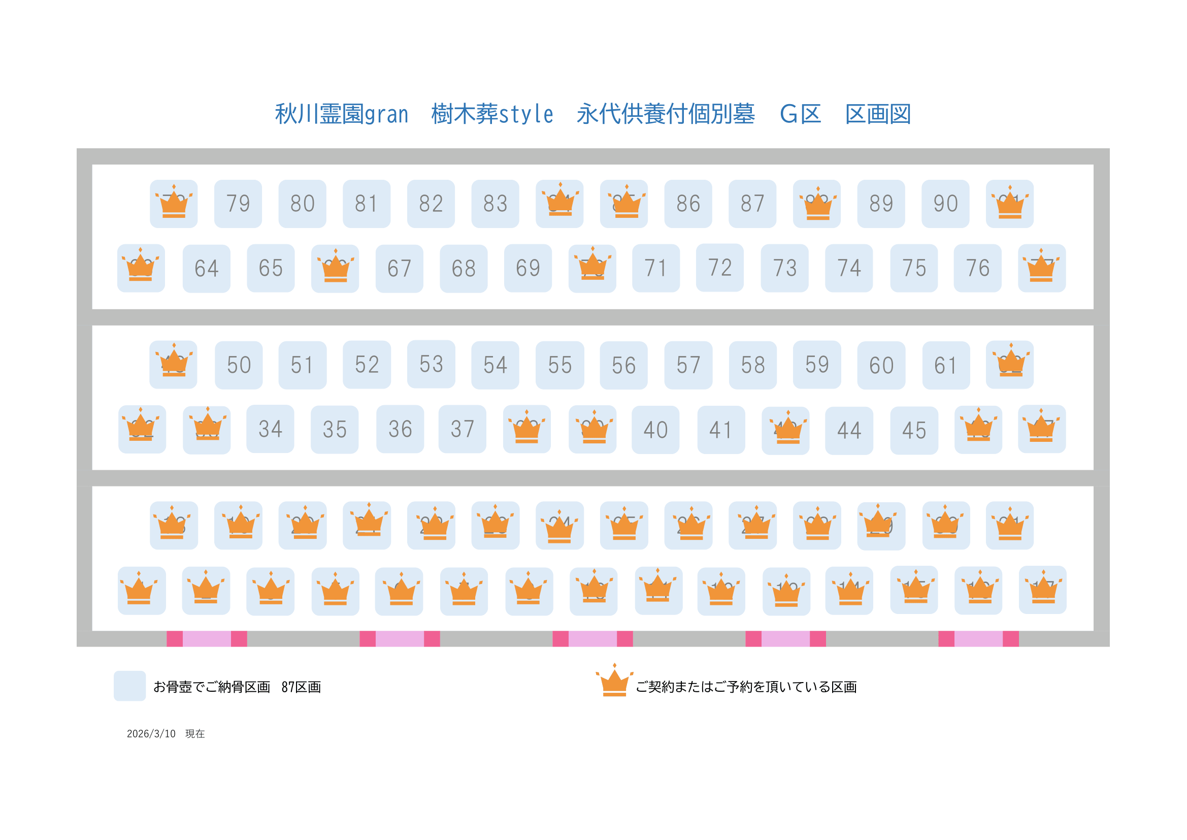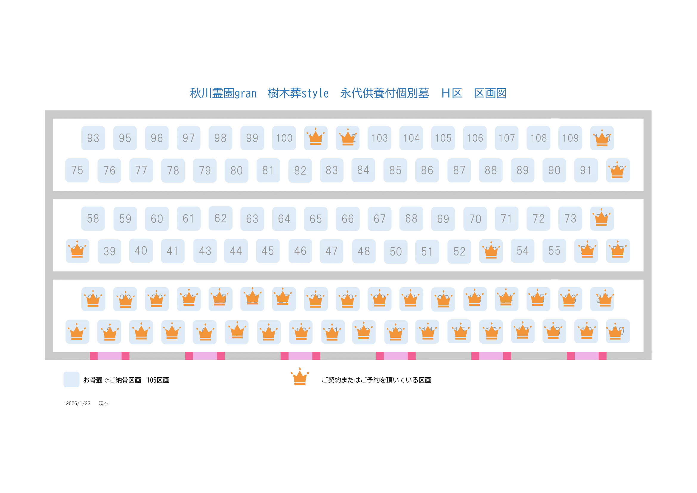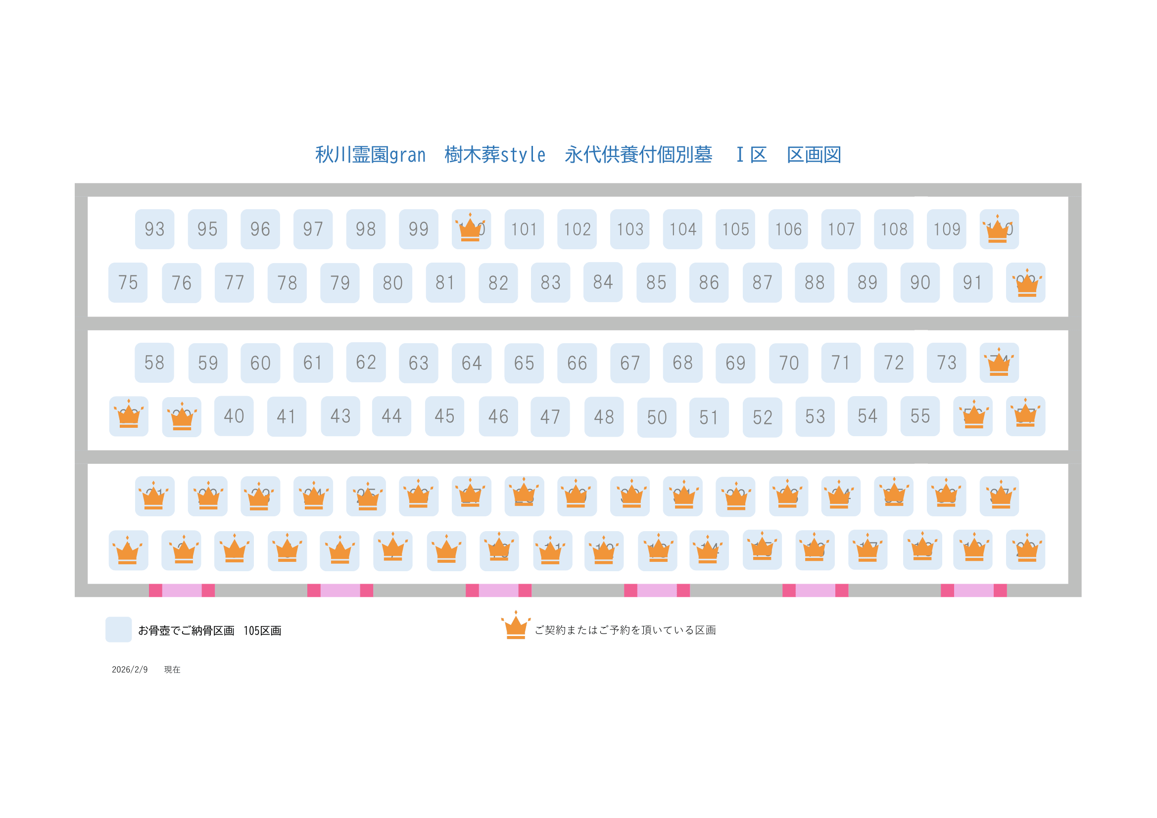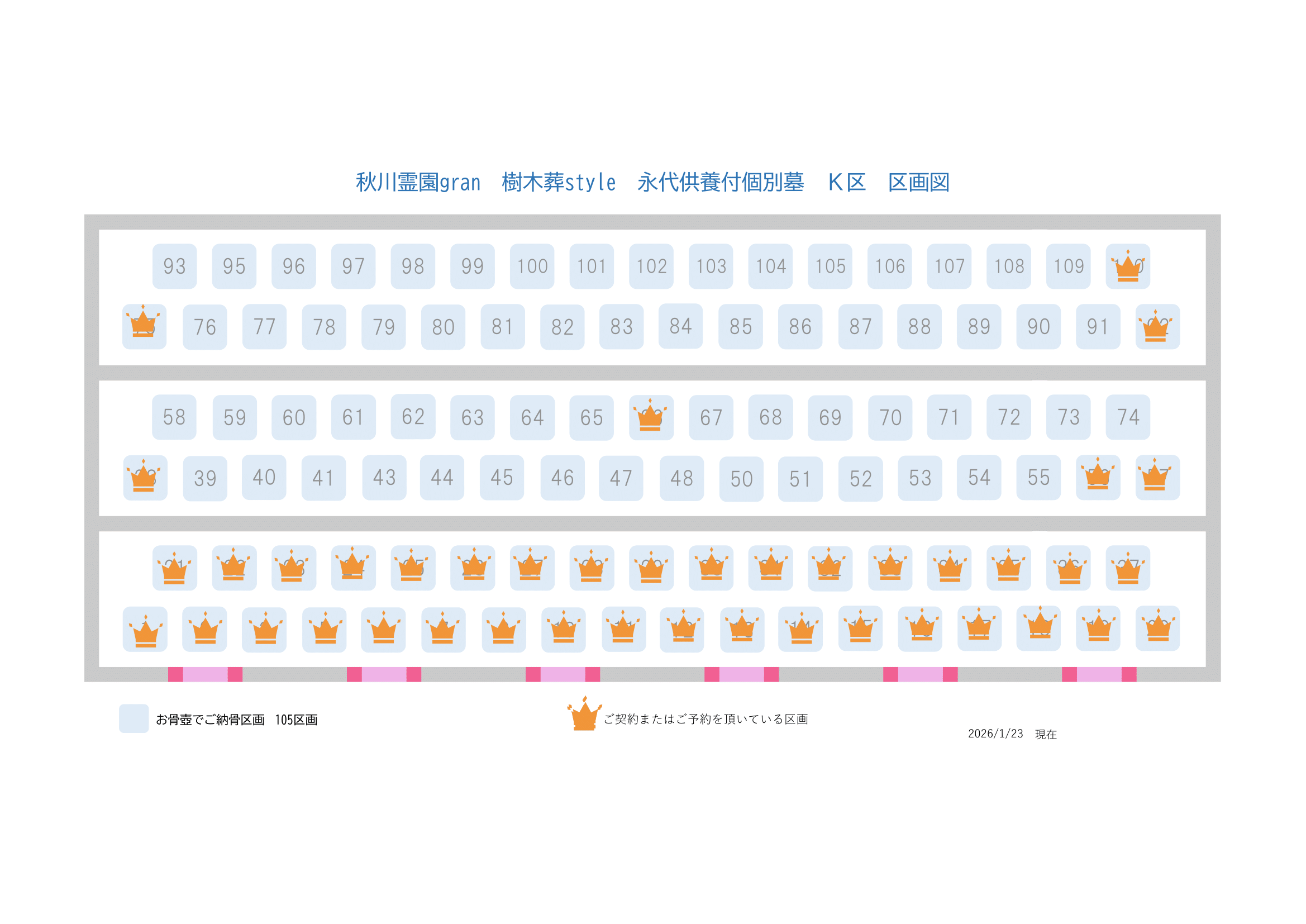 秋川霊園granでは、A~Gの7区画に、2025年9月より新たにH〜Lの新区画が加わった全12区画の樹木葬墓地をご用意いたしております。