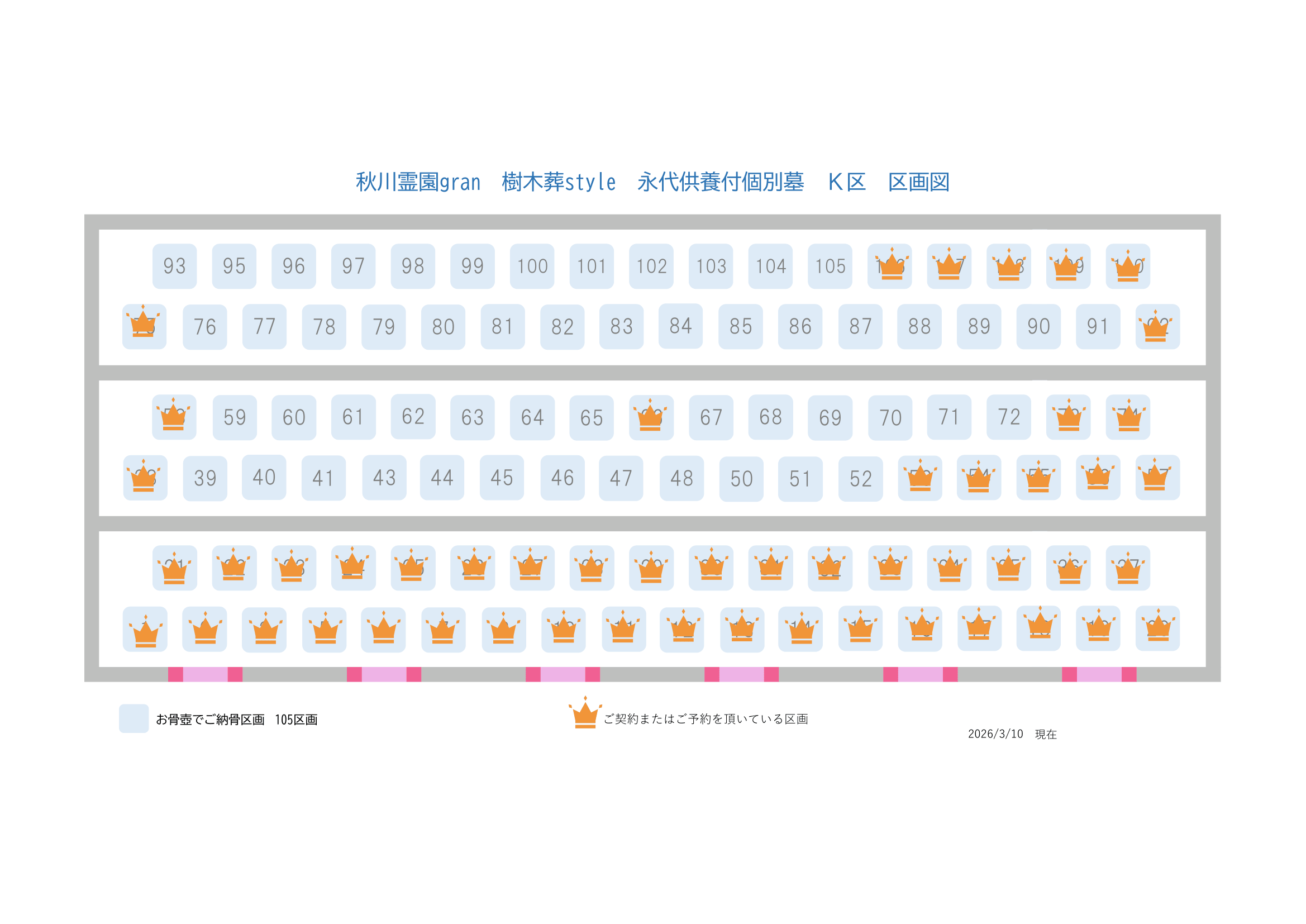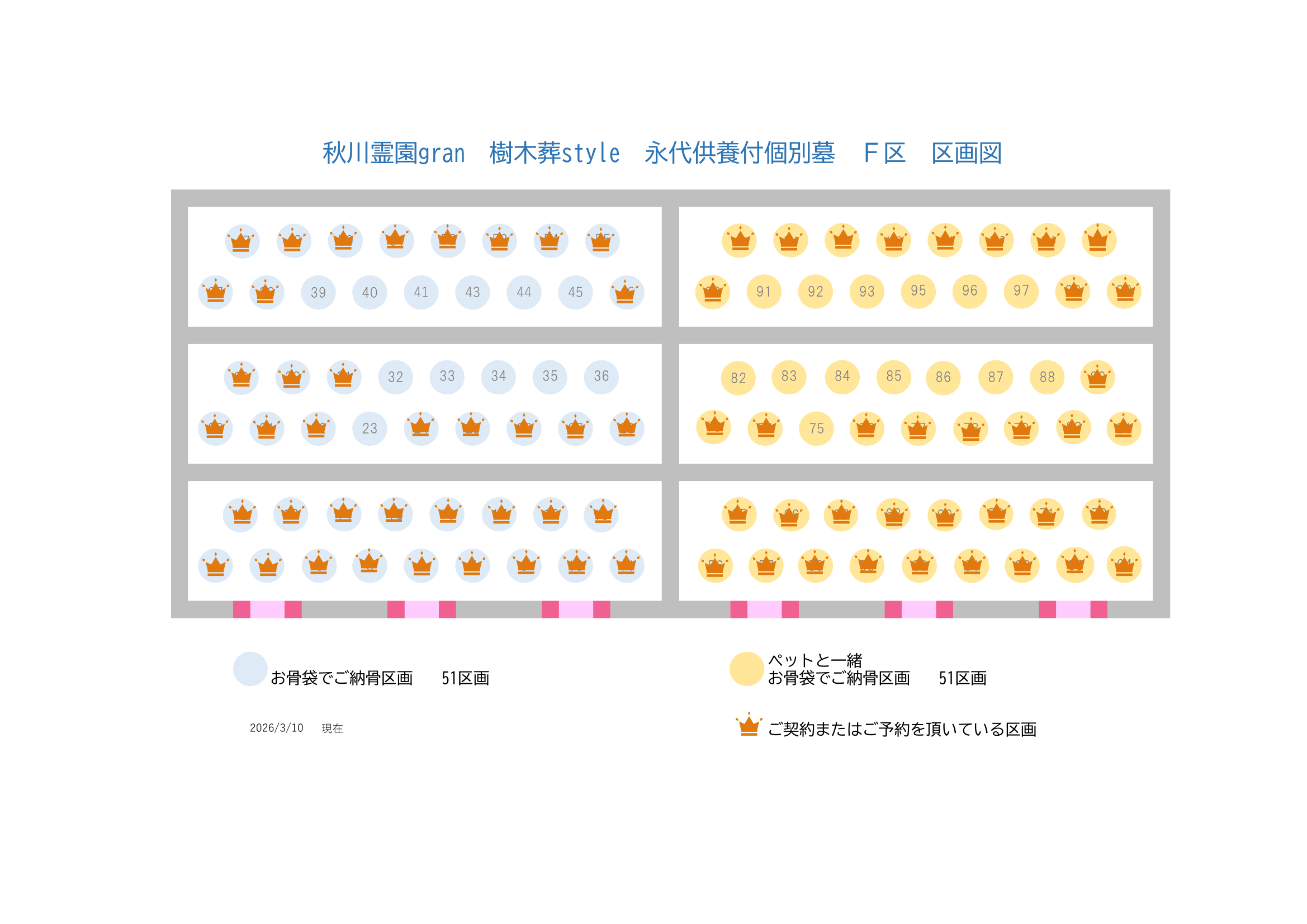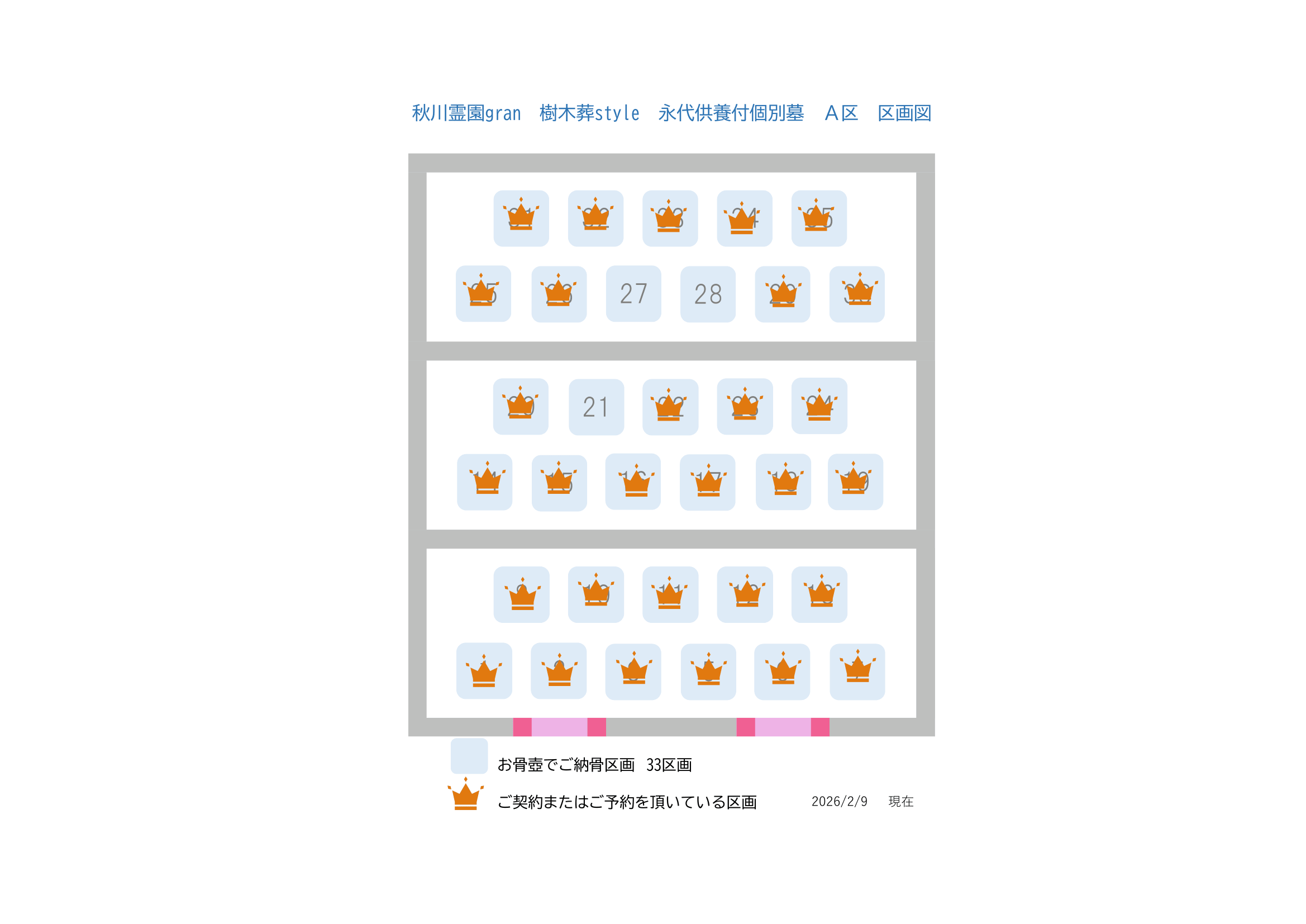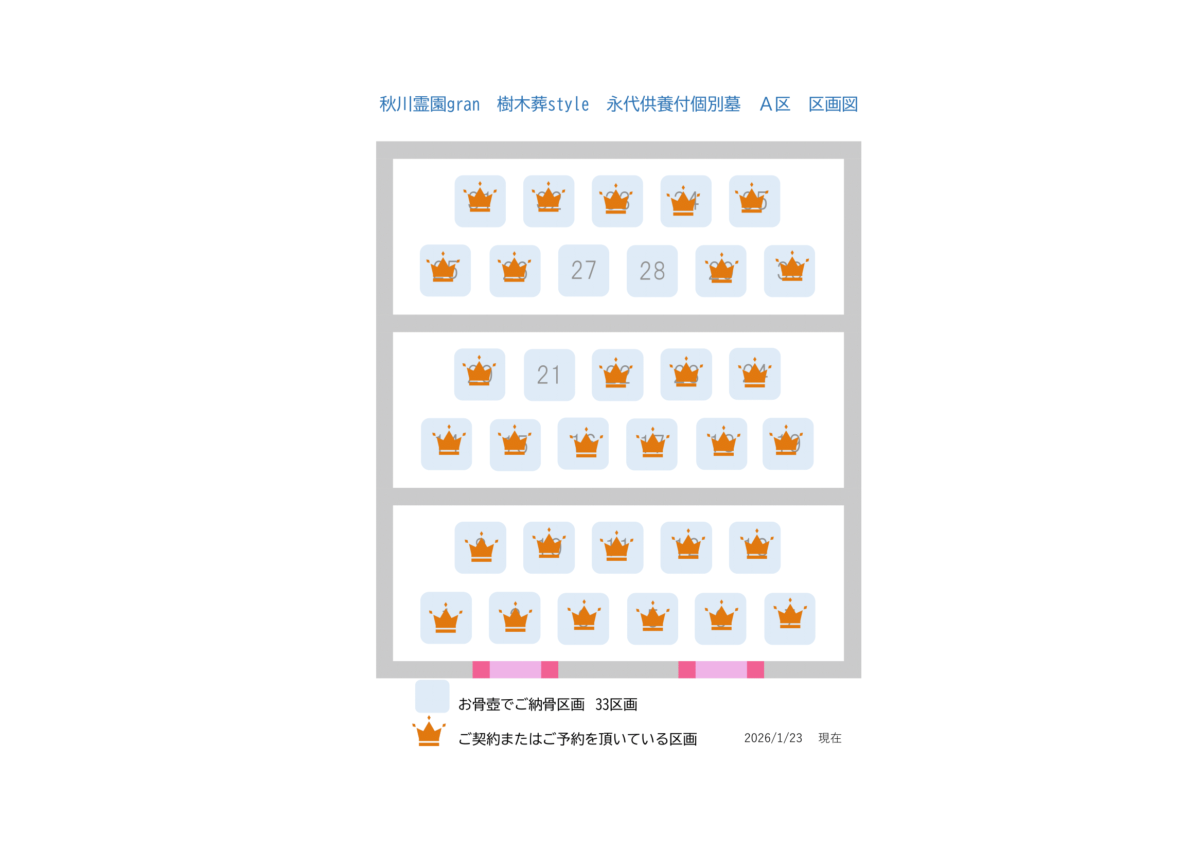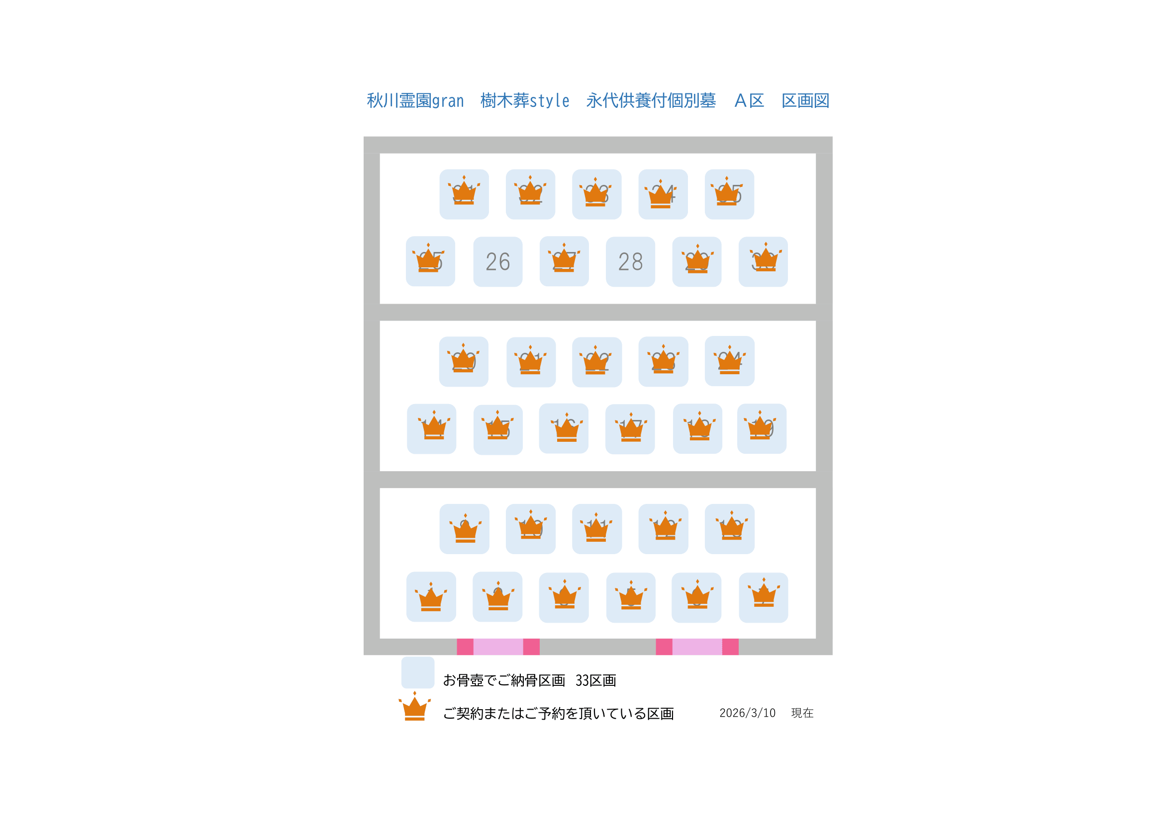 秋川霊園granでは、A~Gの7区画に、2025年9月より新たにH〜Lの新区画が加わった全12区画の樹木葬墓地をご用意いたしております。