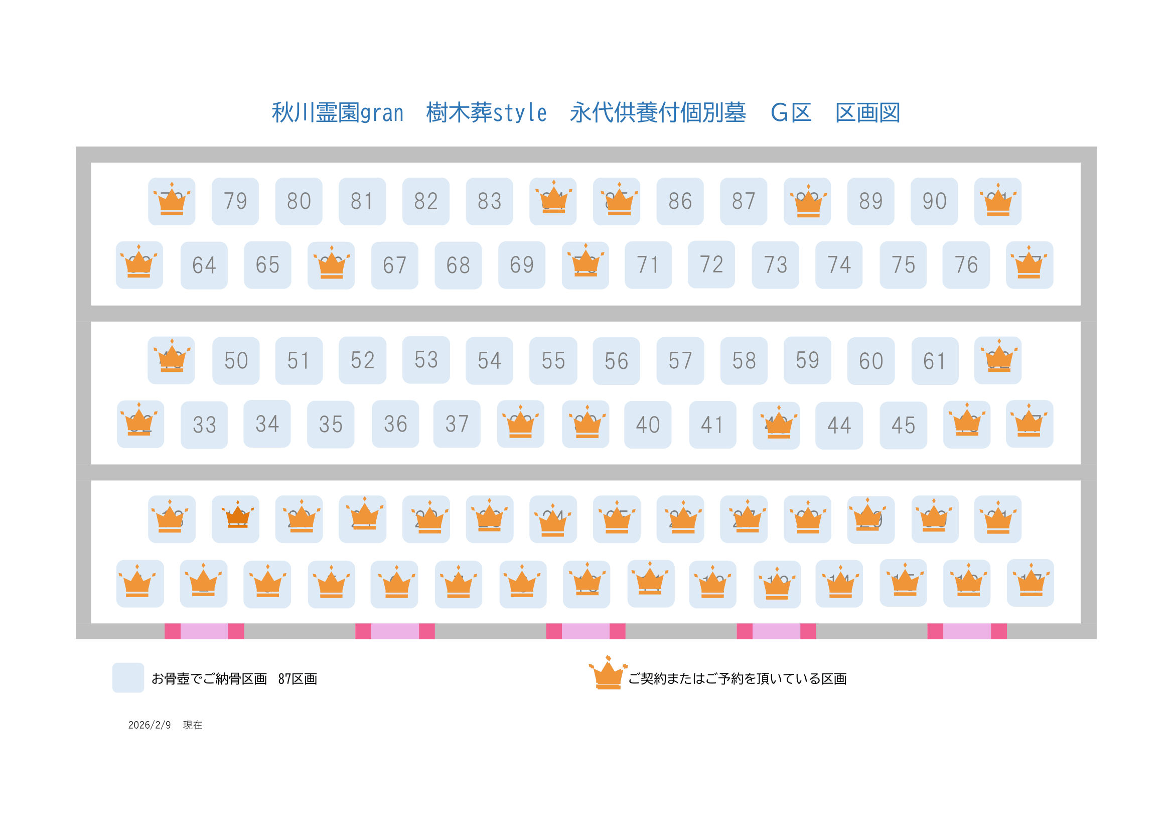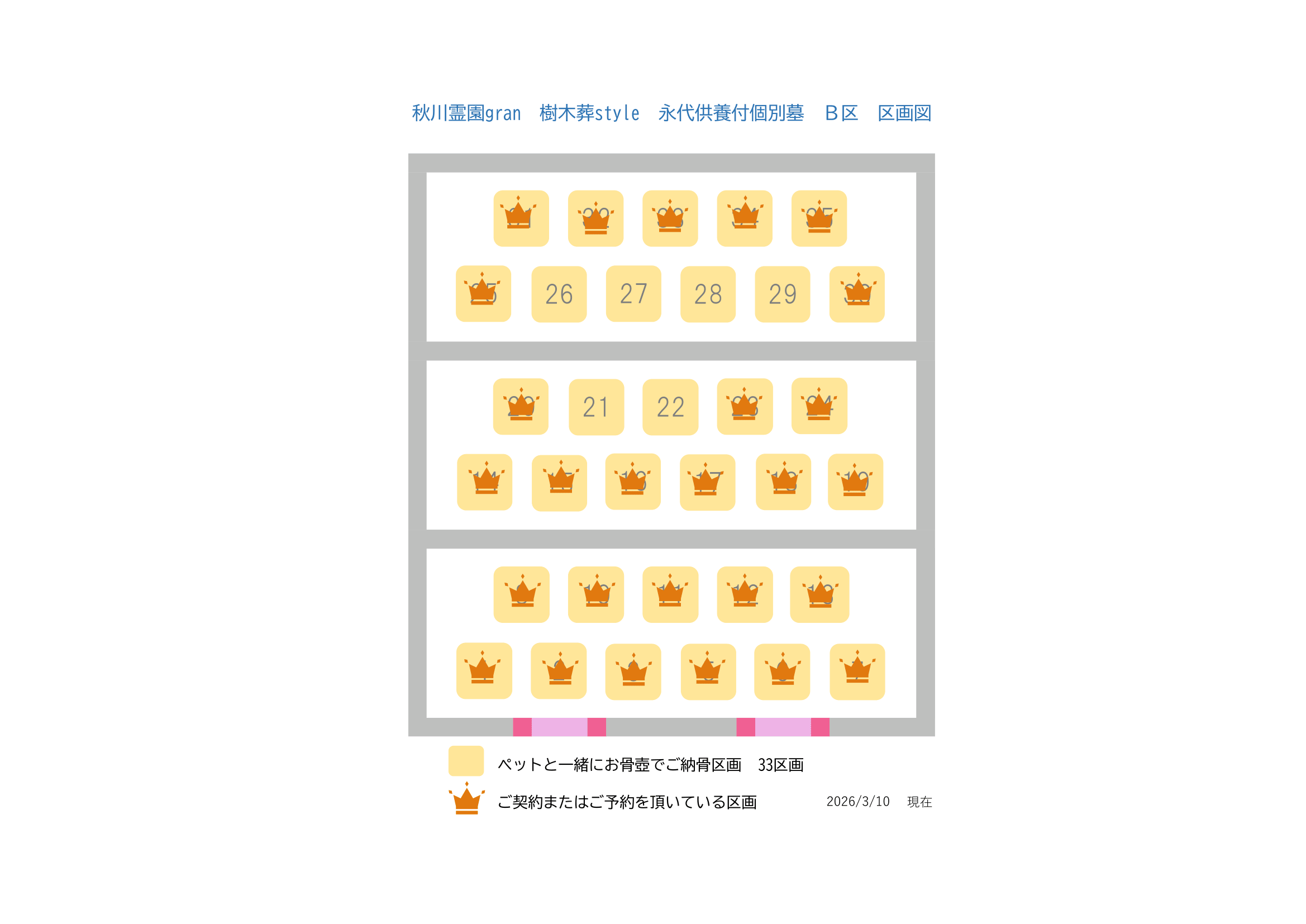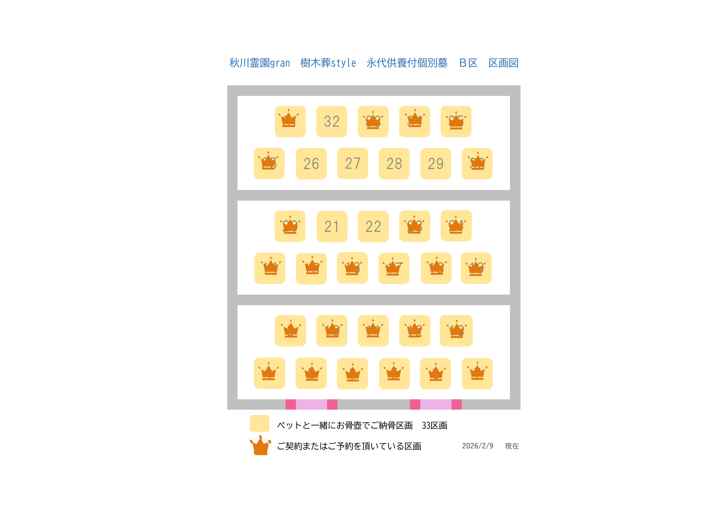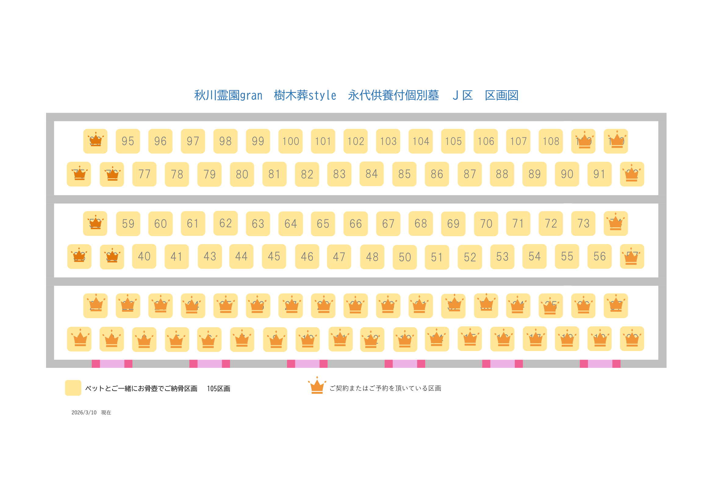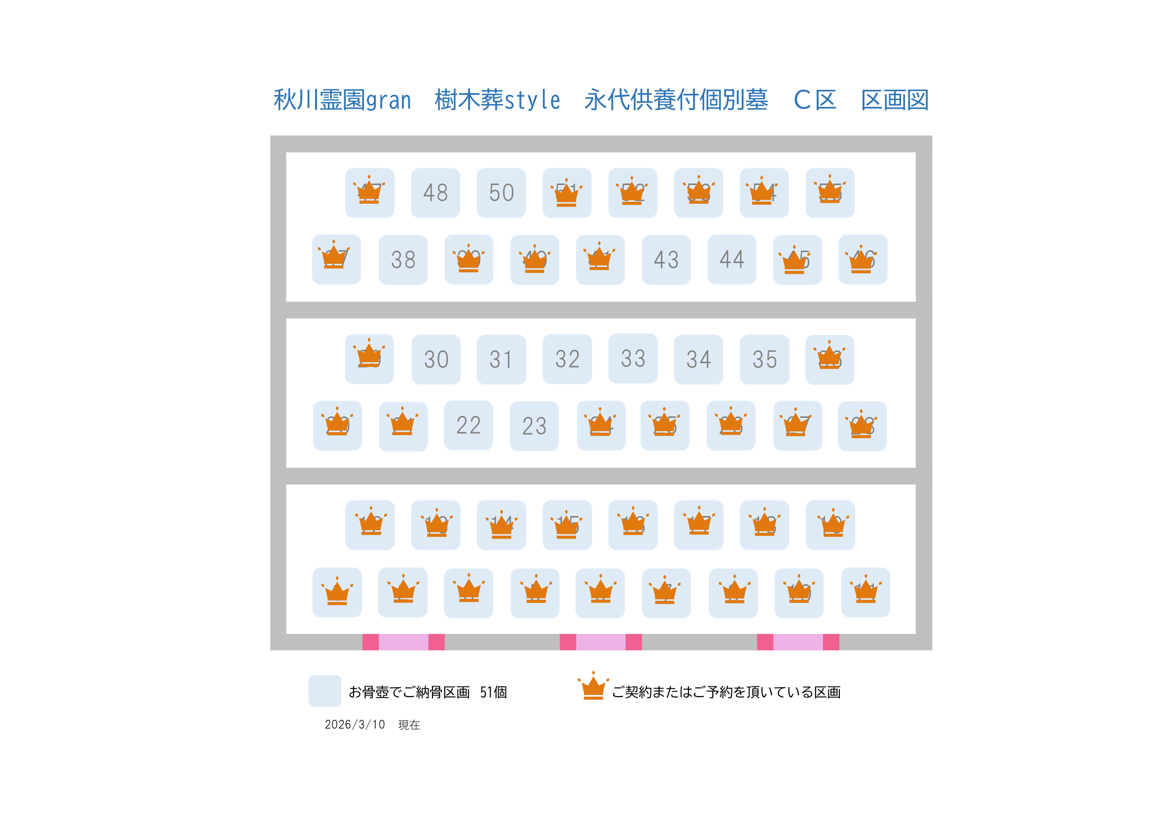 秋川霊園granでは、A~Gの7区画に、2025年9月より新たにH〜Lの新区画が加わった全12区画の樹木葬墓地をご用意いたしております。