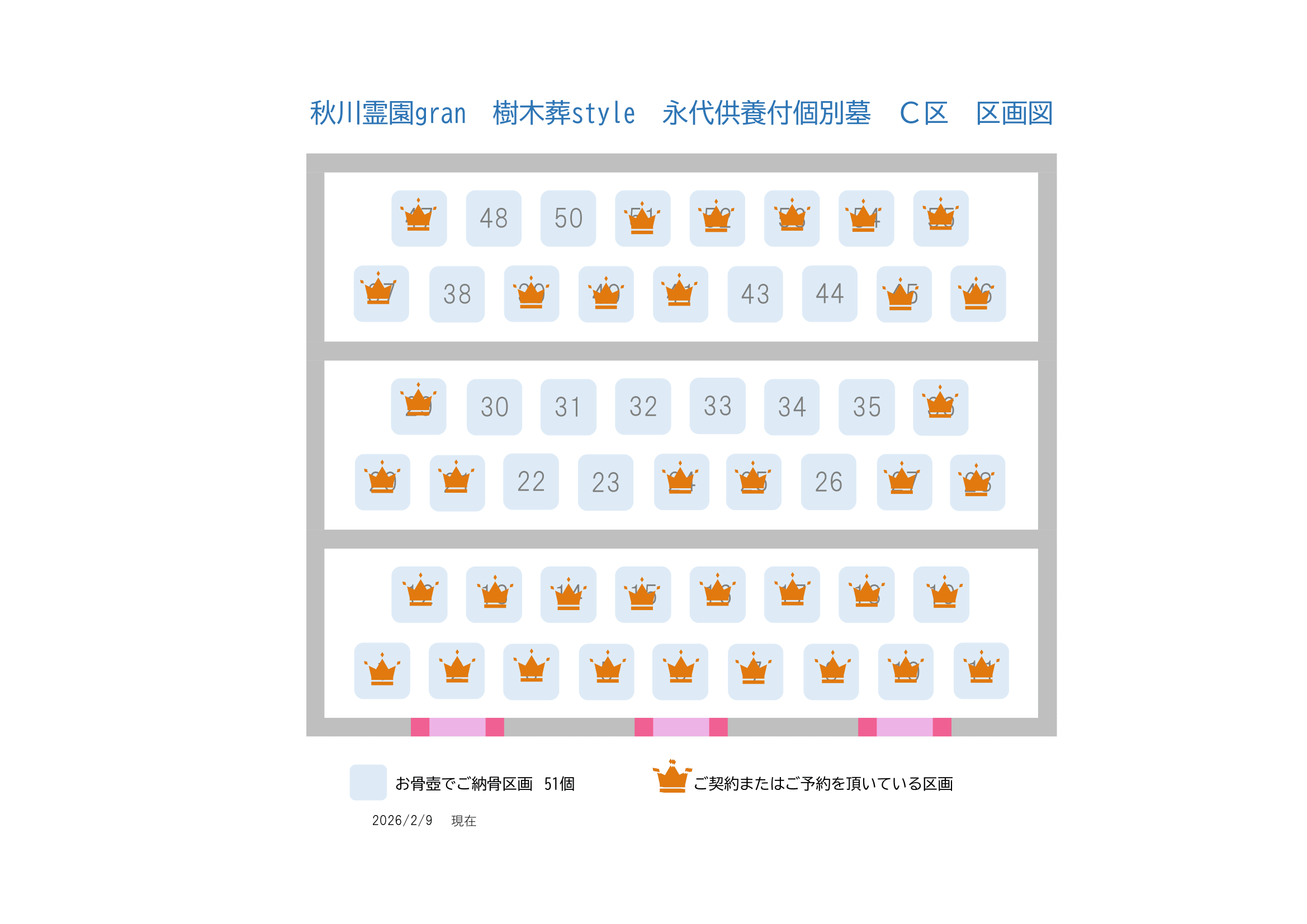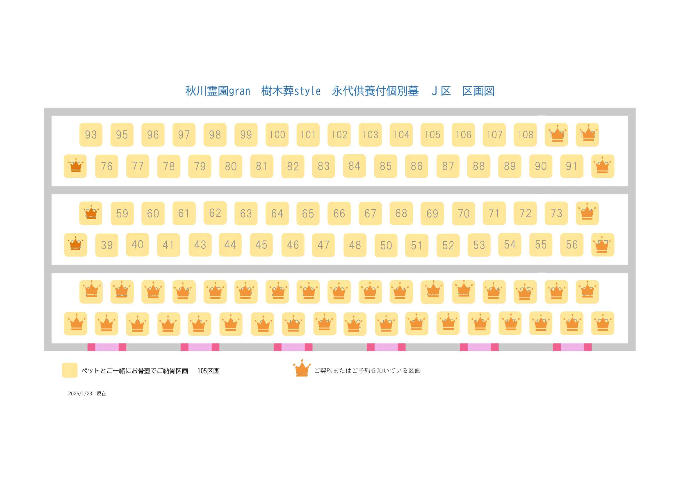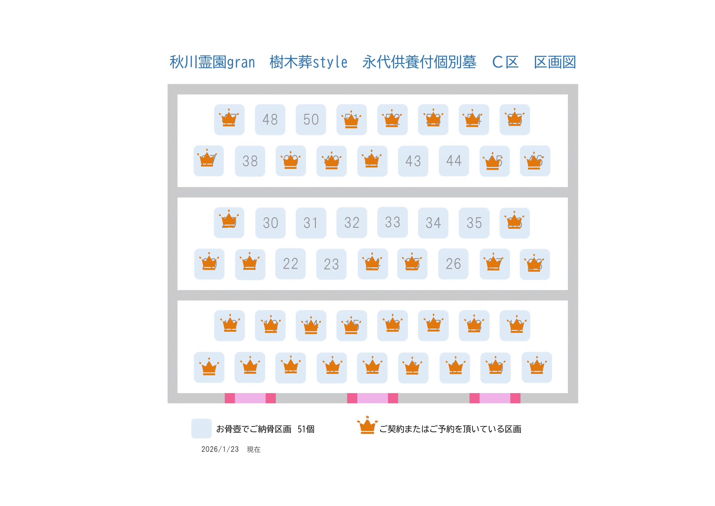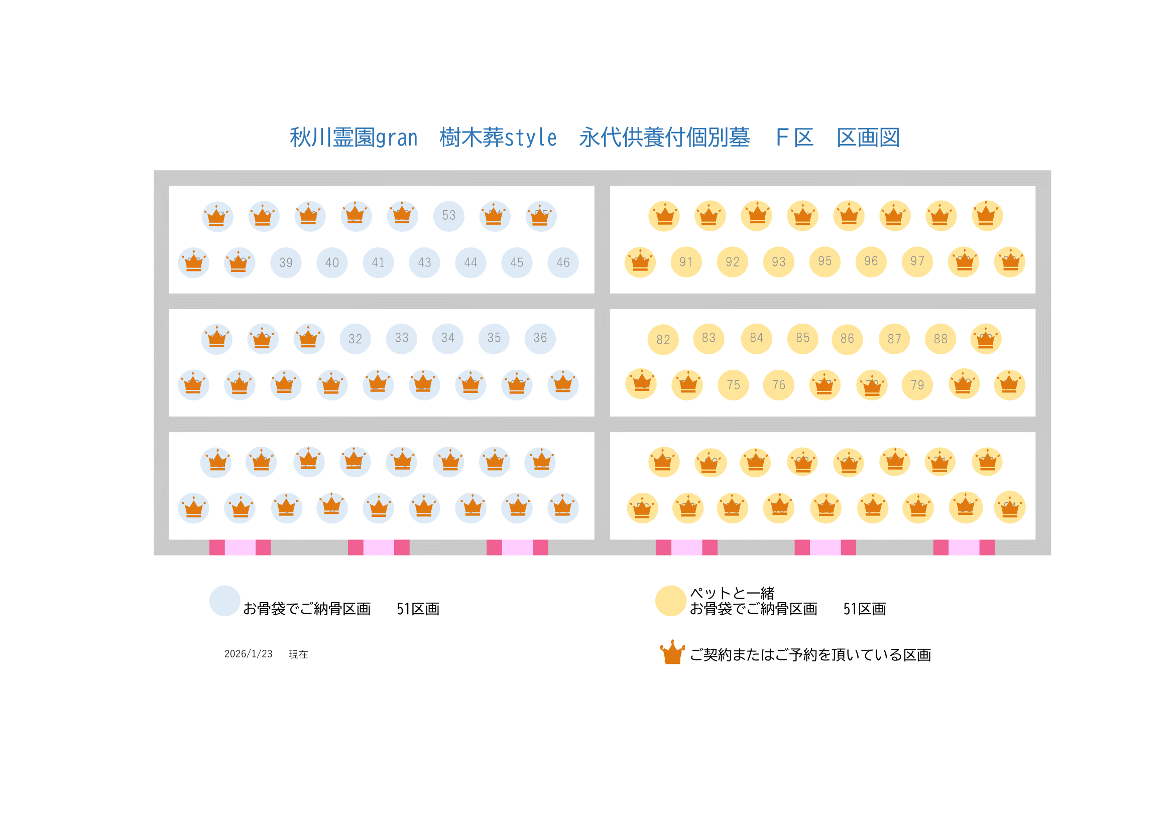 秋川霊園granでは、A~Gの7区画に、2025年9月より新たにH〜Lの新区画が加わった全12区画の樹木葬墓地をご用意いたしております。