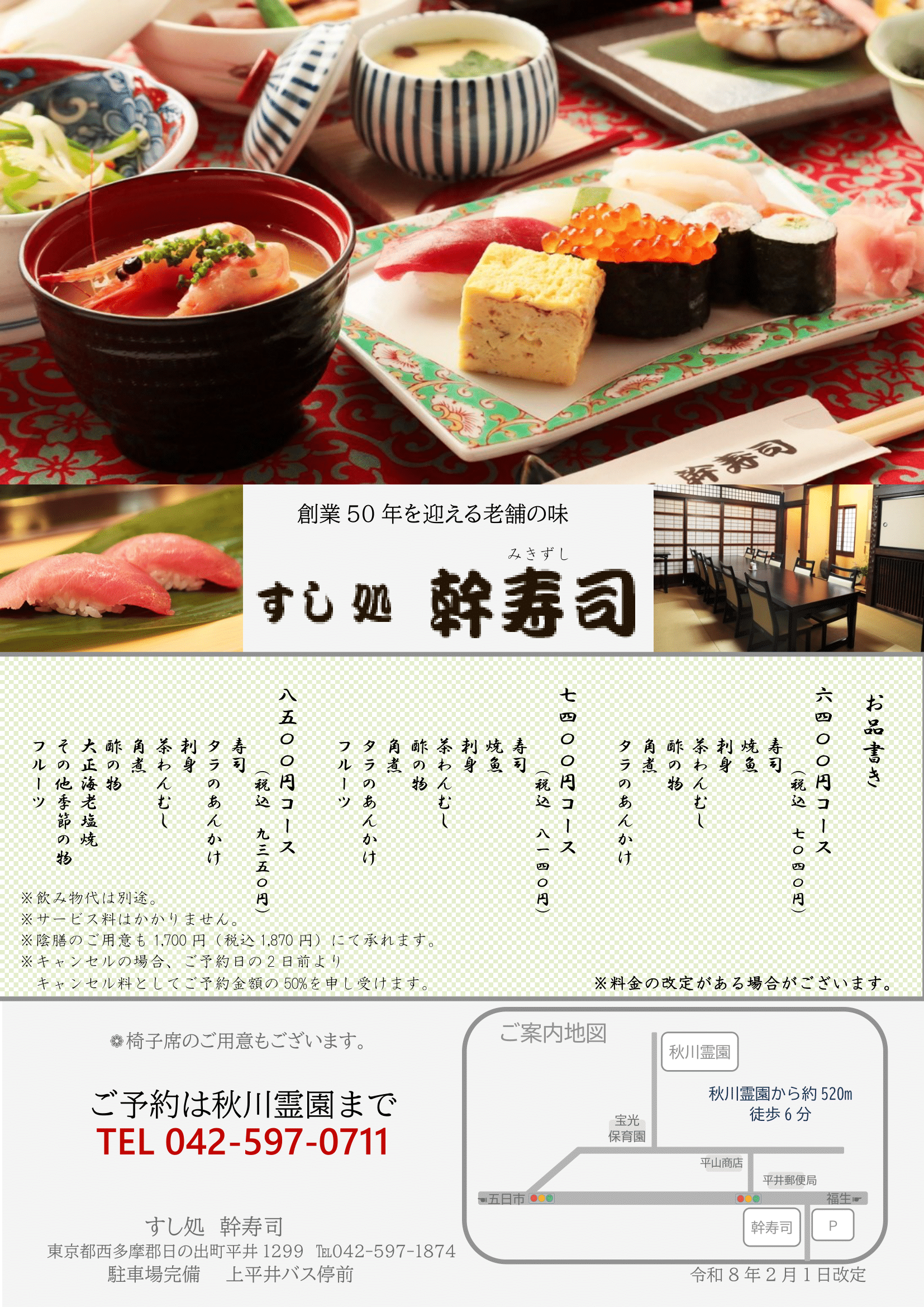法要のご案内 亡くなられた方のご冥福を祈り、供養をする法要のご案内です。 秋川霊園では、忌日法要や年忌法要などの際に本堂法要・法要室法要・墓地法要の中からご希望に合わせてお選びいただくことができます。 また、お塔婆やお花、果物などのお供えなども承りますので、ご相談ください。 お供花・お供物はこちら お塔婆はこちら お申し込み用紙はこちら 内容 価格 本堂法要 50,000円(不課税) 法要室法要 50,000円(不課税) 墓地法要 30,000円(不課税) 追加法要 (1件・霊)10,000円(不課税) ※令和3年2月1日現在の価格です。 料金例 墓地にて49日忌法要と納骨法要の場合:40,000円 墓地にて49日忌法要と納骨法要、位牌開眼法要の場合:50,000円 本堂にて、2霊同時に法要の場合:60,000円 納骨のご案内 ご遺骨を納骨するにあたり、事前準備として書類の提出、納骨室の(カロート)清掃などを行います。 当日は納骨を行い、お客様のサポートもいたします。 後日、目地止めを行います。 お申し込み用紙はこちら 内容 料金 3㎡未満 33,000円(税込) 5㎡未満 44,000円(税込) 8㎡未満 55,000円(税込) 8㎡以上 66,000円(税込) ※令和3年2月1日現在の価格です。 墓誌彫刻のご案内 墓石やお墓の横に建てられる石碑の墓誌には、そのお墓に納骨されている故人のお名前や戒名、没年月日などが彫刻されています。 御納骨の際に合わせてご依頼ください。 内容 料金 1霊 55,000円(税込) ※令和3年2月1日現在の価格です。 お申し込み用紙はこちら お塔婆のご案内 お塔婆は故人様へのお手紙ともいわれています。 大切な方へのご供養に、お塔婆のご注文を承っております。 内容 料金 1本 3,000円(不課税) ※令和3年2月1日現在の価格です。 当霊園の僧侶が一本一本手書にて書かせていただいております。 間違いがあってはいけないので、ご依頼の際は、ファックスやメールでお願いします。 また施主名にはフリガナもお願いいたします。 お申し込み用紙はこちら お位牌のご案内 御位牌は様々なデザインや材質、価格からお選びいただくことができます。 当霊園ではお位牌の一大産地、福島県会津で造られた国産位牌(会津塗)をご案内しております。 宗派や地域の風習などの慣例もございますので、お気軽にご相談ください。 お申し込み用紙はこちら お供花・お供物のご案内 供花のご案内 ご法要用の供花をご予約にて承っております。 本堂や法要室の祭壇へのお飾り用や お墓のお供え用として様々なラインナップをご用意しております。 ご利用になる日の1週間前までにお申し込みください。 写真は一例となります。全て税込価格での表示となっております。 ※画像クリックすると大きな画像でご覧いただけます。 お供物のご案内 大切な方のご供養に、ご法要用の供物をご予約にて承っております。 本堂でのご本尊様へのお供物や、法要室、墓前での故人様へのお供え物として フルーツの盛かごを取り揃えました。 ご利用になる日の1週間前までにお申し込みください。 写真は一例となります。全て税込価格での表示となっております。 ※画像クリックすると大きな画像でご覧いただけます。 会食・お弁当のご案内 ご法要の後のご参列頂いた方とのお食事のご案内を承ります。 ご予算やご列席の皆様のお好みに合わせて最適なものをご用意いたします。 ※画像クリックすると大きな画像でご覧いただけます。 会食のご案内 ご利用日 令和8年2月1日分より料金改定 幹寿司のサイトはこちら https://hinode-mikizushi.com/ お持ち帰り弁当のご案内 深山のサイトはこちら https://shinzan.info/