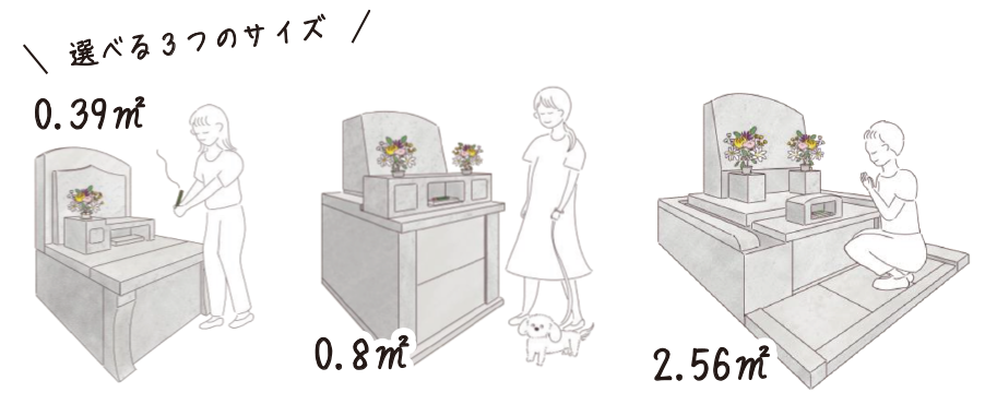 秋川霊園の一般墓は、0.39㎡・0.8㎡・2.56㎡の3つのサイズから選べる、石種によって選べる4つの価格プランからお選びいただくことができます。