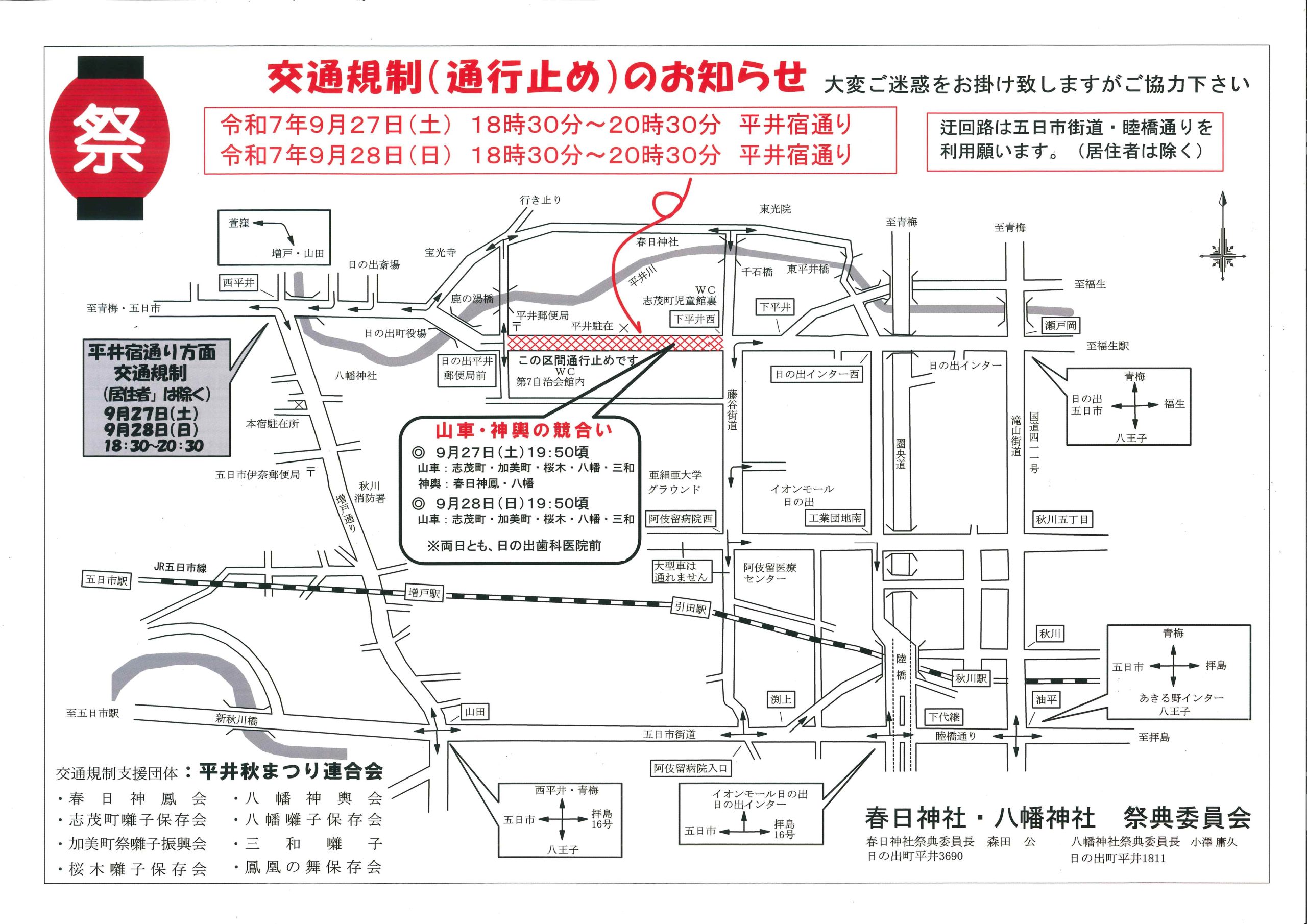 お知らせ 9月27日(土)、28日(日)平井秋まつりに伴う交通規制について 2025.08.26 9月27日(土)および28日(日)は、「日の出町平井祭り」の開催に伴い、周辺道路にて交通規制が実施されます。 ご来園を予定されている皆さまにおかれましては、当日の交通状況をご確認のうえ、十分にご注意いただきながらお越しくださいますようお願い申し上げます。 皆さまのご理解とご協力を賜りますよう、よろしくお願いいたします。